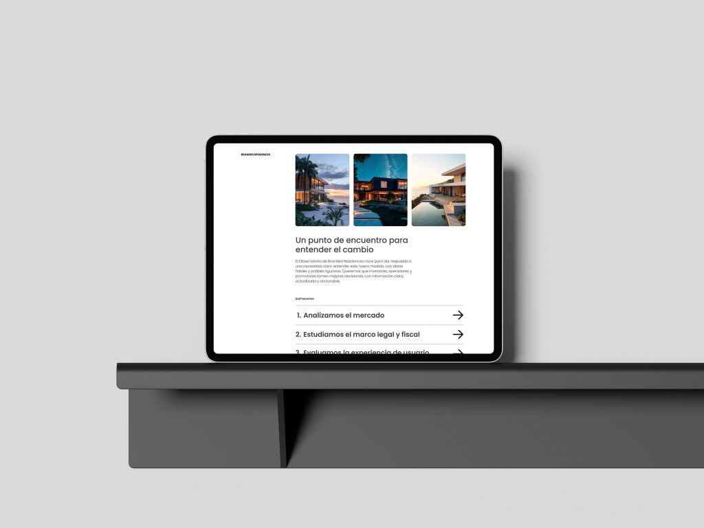 La web de Branded Residences se diseñó como una plataforma estratégica capaz de explicar un concepto complejo de forma clara y aspiracional. El objetivo era que el usuario entendiera en segundos el valor diferencial del modelo. La arquitectura de información se simplificó para guiar al visitante a través de qué son, qué aportan y cómo una marca transforma la experiencia residencial. El contenido se estructuró con criterio editorial para facilitar una lectura ejecutiva.